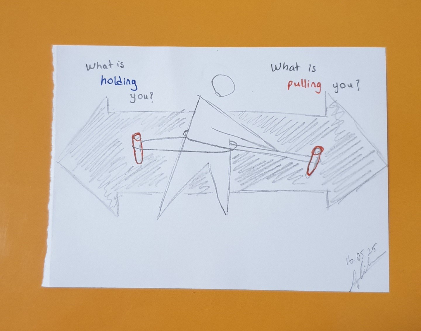 The idea is similar to a rubber band that stretches between two points. One side represents the forces that keep you in your current situation, such as stability, routine, or fear of change. The other side represents what pulls you forward — the desire for growth, new experiences, or personal goals. When you explore both directions, you can see more clearly which one matters more to you.